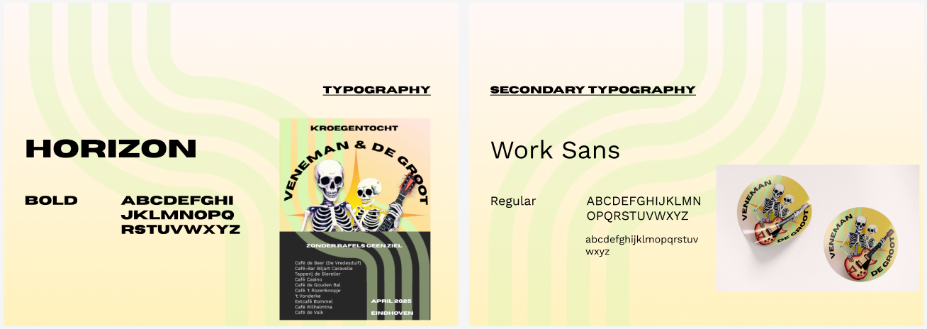 Na feedback te hebben gekregen over de brandguide (dat de letters op zichzelf weinig zeggen), heb ik voorbeelden toegevoegd waar de typografieën worden gebruikt. Dit maakt meteen duidelijk hoe de fonts toegepast worden in situaties, zoals posters en stickers.