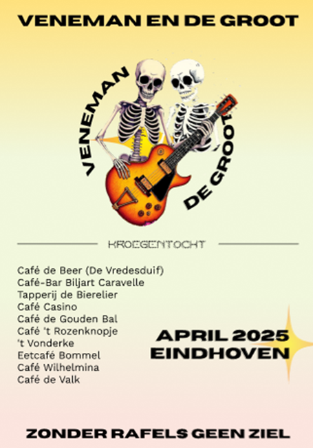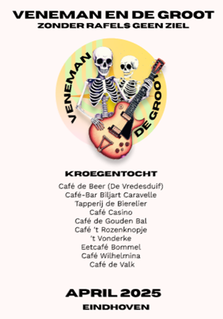 o De datum en locatie van de kroegentocht worden groot en dikgedrukt weergegeven. Dit maakt de belangrijke informatie