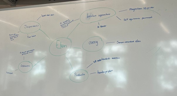 De eerste dag kregen we de opdracht om een ‘What if’ statement te definiëren. Het idee waar we op kwamen: “wat is er geen supermarkten meer zijn?”. En het idee was een pil die je inneemt, waar genoeg voedingsstoffen in zitten en je het op een hele andere beleving meemaakt. Het kan zijn dat wanneer je zo’n pil inneemt dat je bijvoorbeeld pasta in Italië aan het eten bent.