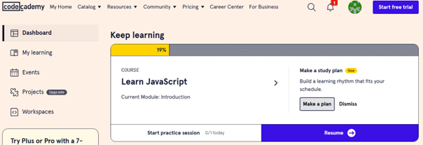 Om JavaScript beter onder de knie te krijgen, ben ik gaan oefenen op Codecademy. Ik merk dat ik de concepten veel beter begrijp wanneer ik zelf aan de slag ga. Door actief te oefenen, fouten te maken en direct feedback te krijgen, leer ik veel sneller. Het helpt me om zelf dingen uit te proberen, in plaats van alleen uitleg te krijgen van anderen.